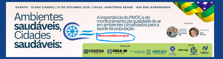 O Conselho Regional de Engenharia e Agronomia de Sergipe (Crea-SE), em parceria com a Rede de Vigilância Sanitária de Aracaju, realiza na próxima sexta-feira (31) o encontro “Ambientes Saudáveis, Cidade Saudável: PMOC e Qualidade do Ar em Ambientes Climatizados”, ocasião em que será lançado o Selo de Qualidade do Ar em Ambientes Climatizados — uma iniciativa inédita que reconhece e incentiva as boas práticas de manutenção, operação e controle de sistemas de climatização.