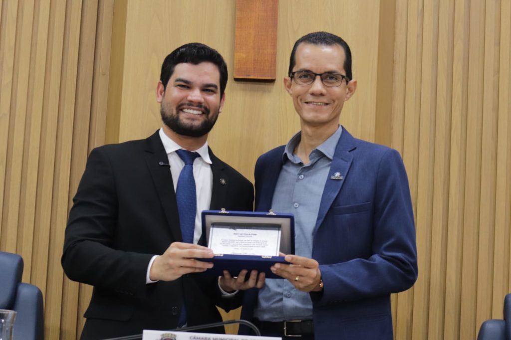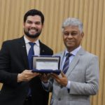 O presidente do Crea-SE, engenheiro Dilson Luiz (dir.), recebeu das mãos do vereador Maurício Maravilha (esq.), a placa de homenagem.