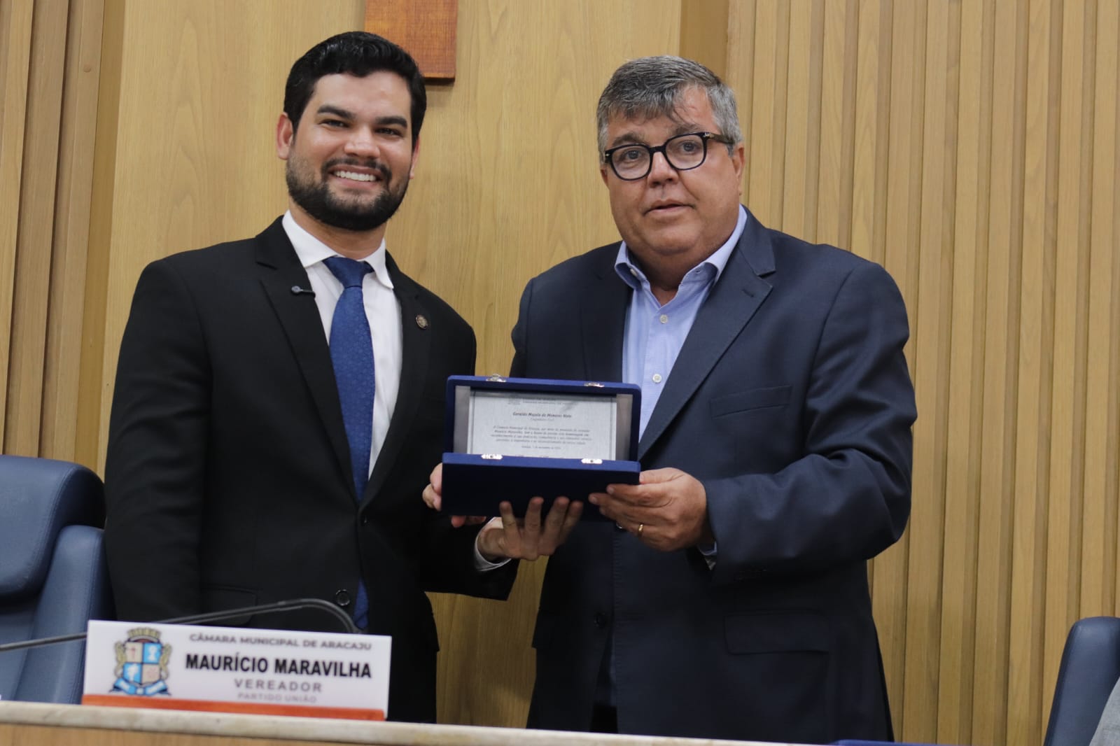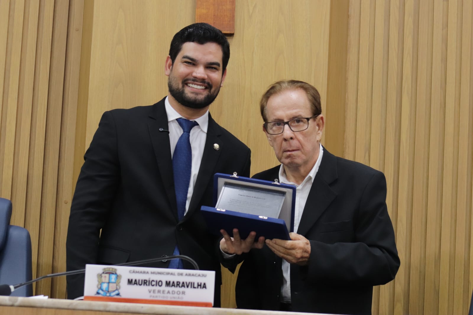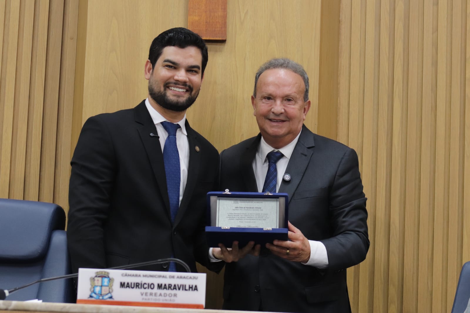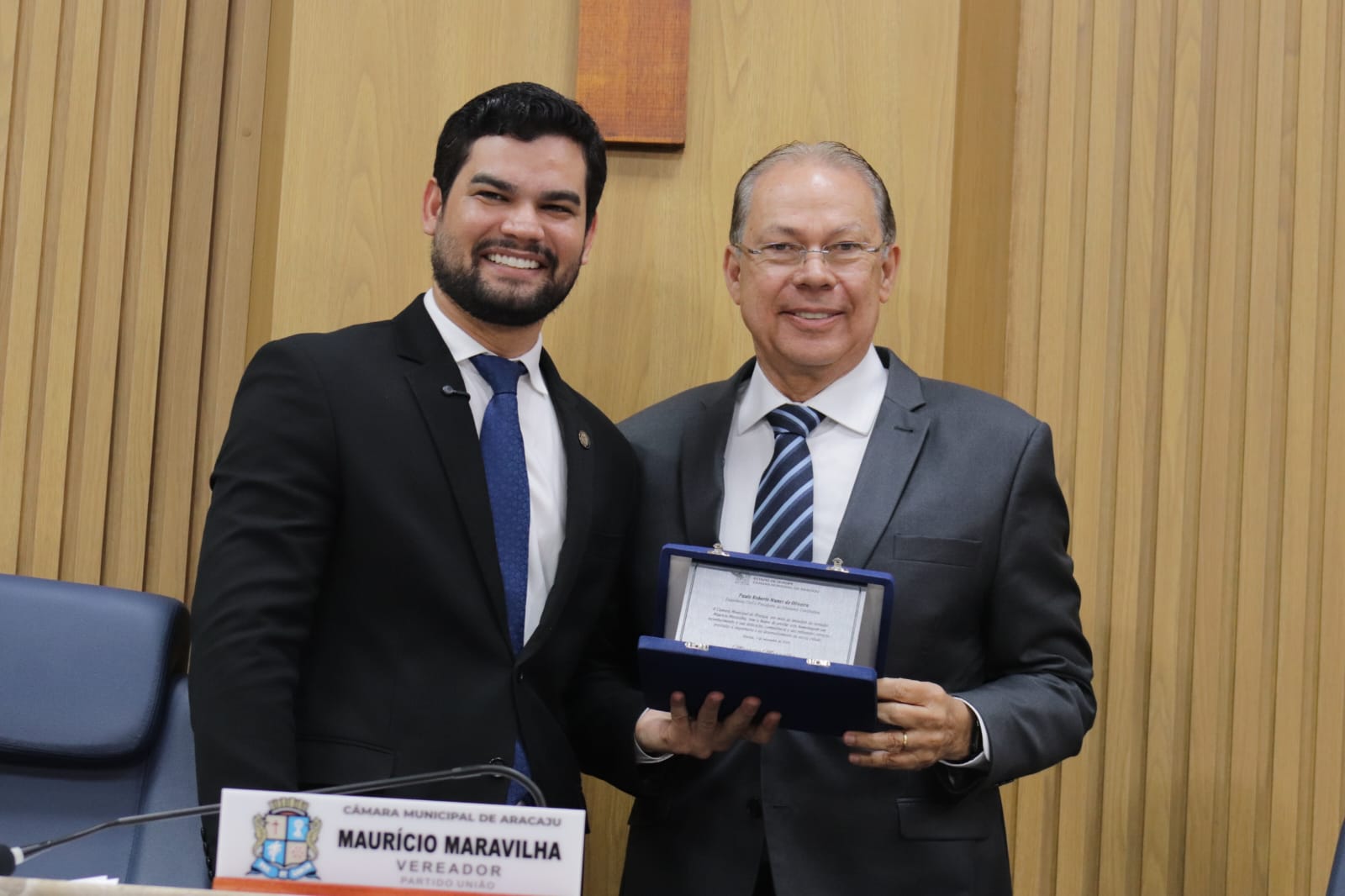 O presidente do Crea-SE, engenheiro Dilson Luiz (dir.), recebeu das mãos do vereador Maurício Maravilha (esq.), a placa de homenagem.