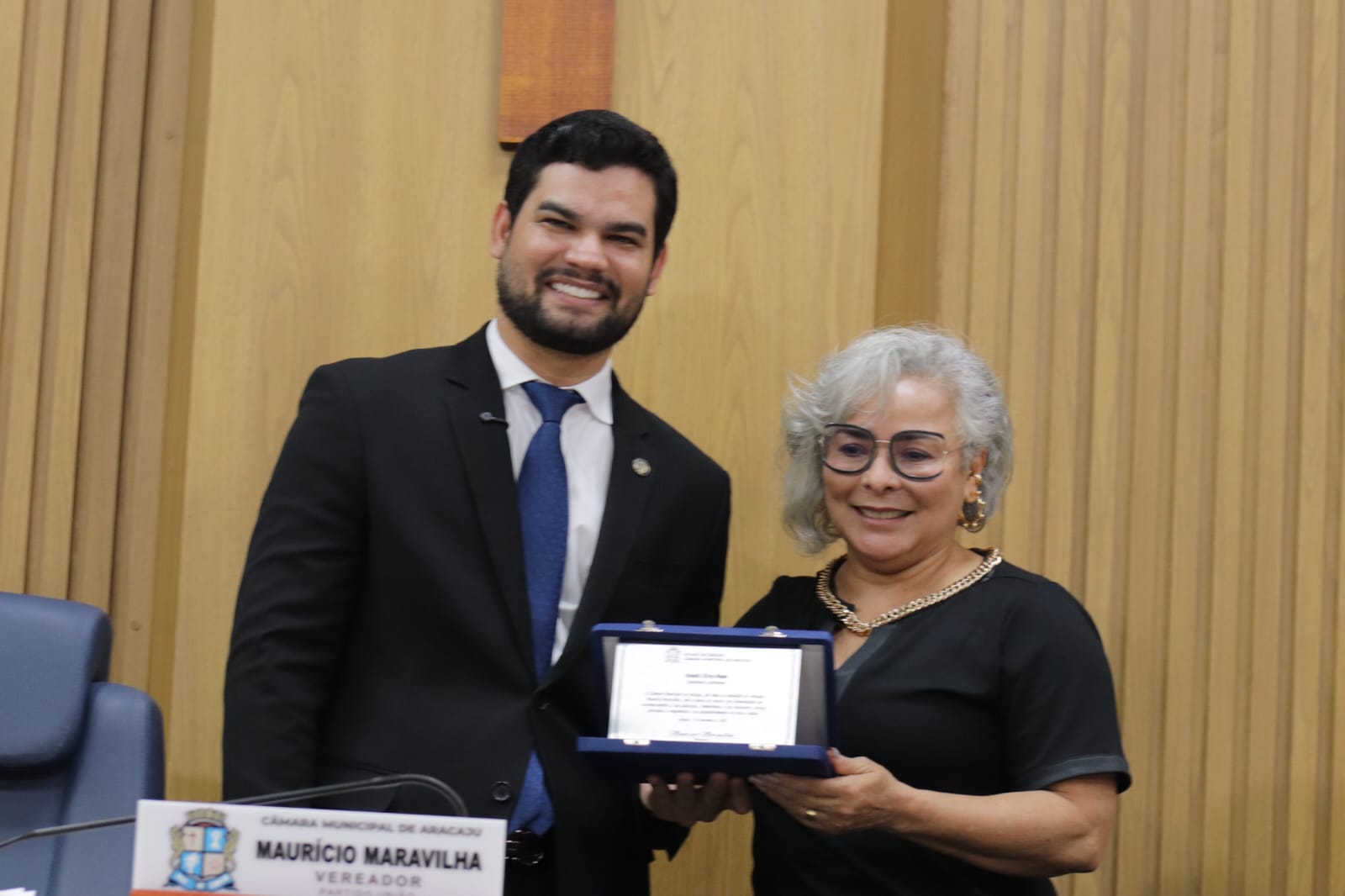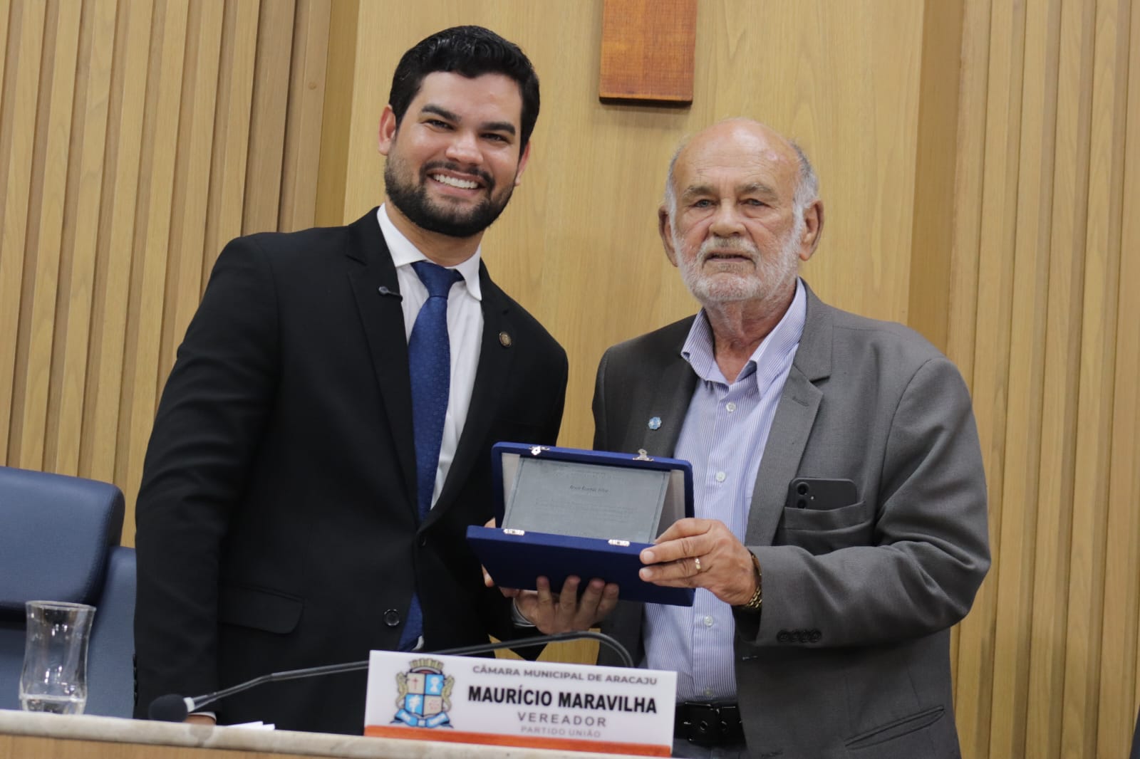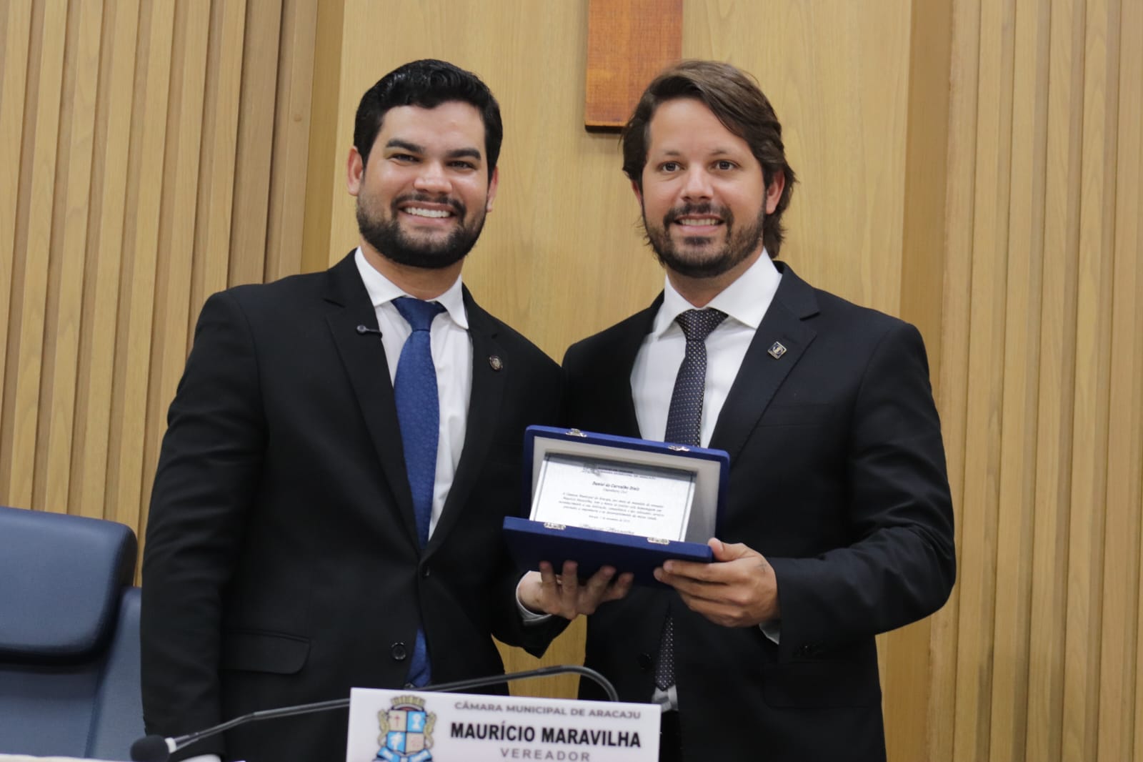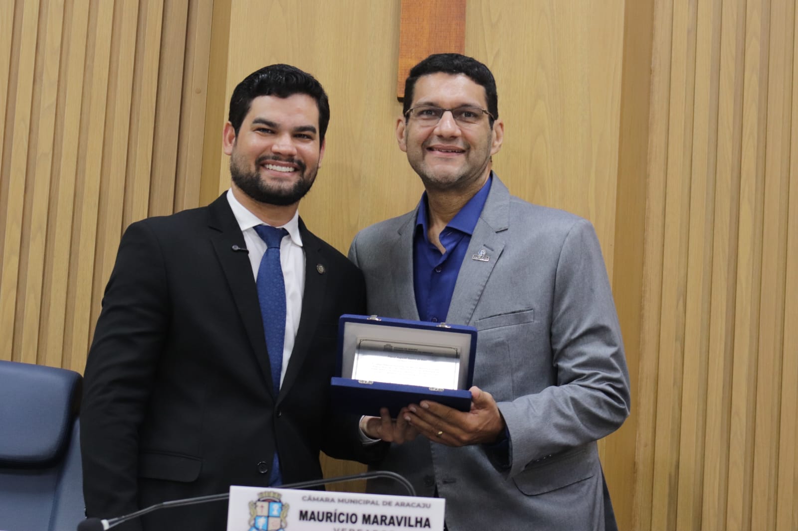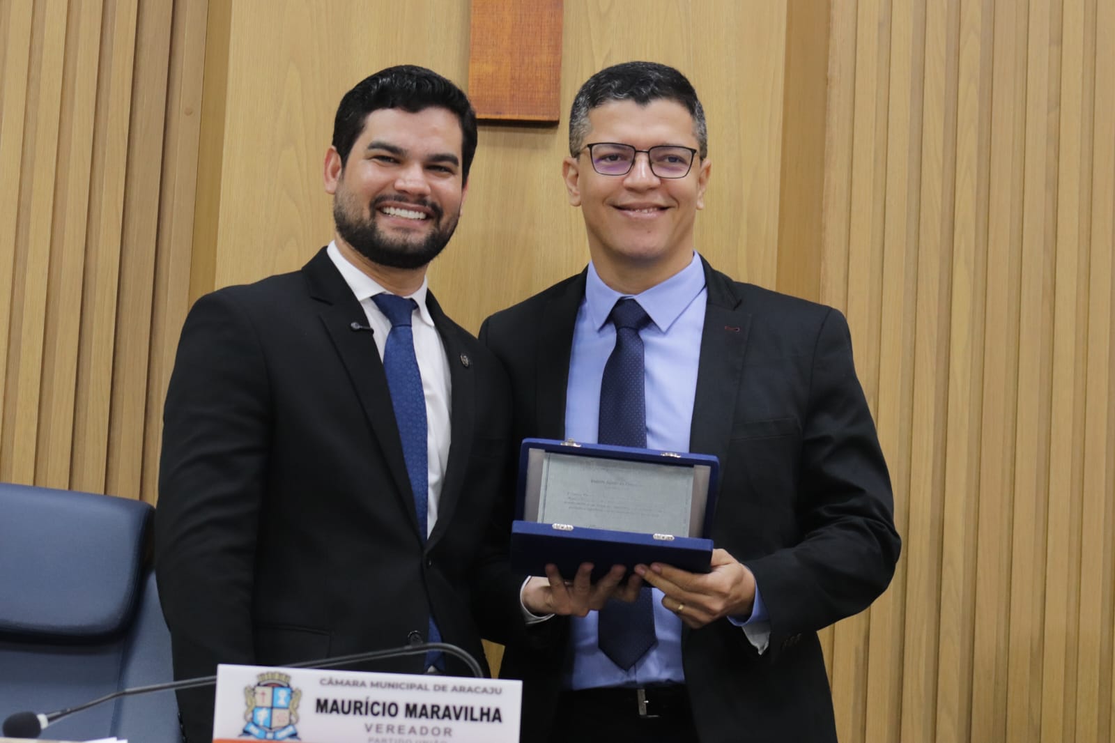 O presidente do Crea-SE, engenheiro Dilson Luiz (dir.), recebeu das mãos do vereador Maurício Maravilha (esq.), a placa de homenagem.