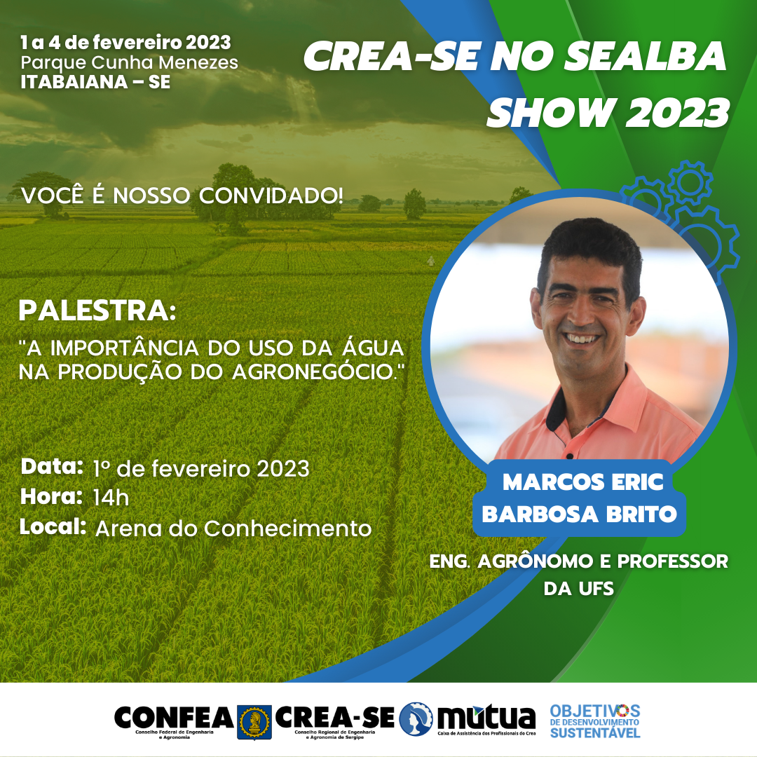 “O uso da água na produção do agronegócio” também é assunto pautado pelo Crea-SE no SEALBA Show. O tema será apresentado pelo engenheiro agrônomo, Marcos Eric Barbosa. “ Participar da SEALBA Show é reforçar para o agronegócio e a sociedade o quanto a Engenharia é fundamental para o desenvolvimento das tecnologias no campo. Na agricultura, as engenharias se convergem. Trata-se de uma série de profissões capazes de ser abrigadas para responder às demandas de desenvolvimento do campo, o que assegura qualidade, eficiência, competitividade e sustentabilidade, socioeconômica e ambiental. Por isso, é fundamental a participação do Crea-SE em eventos como esse”, afirma o presidente do Conselho, Jorge Roberto Silveira